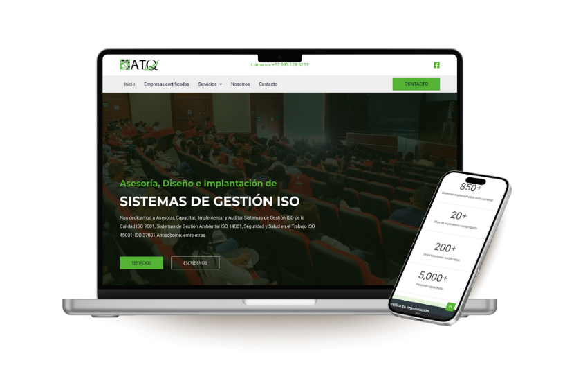 El proyecto para ATQ México consistió en la creación de su presencia digital: un sitio web fundamental para comunicar su alta especialización en sistemas de gestión ISO, un nicho que exige absoluta confianza y claridad. Utilizamos una estructura limpia y profesional, diseñada para transformar información técnica en un mensaje accesible, facilitando la comprensión de sus servicios de asesoría, capacitación e implementación ISO 9001, 14001 y 45001. El resultado fue un portal que no solo actúa como tarjeta de presentación, sino como una herramienta práctica y creíble para sus clientes, estableciendo una base digital sólida y proyectando el profesionalismo que define a la empresa.